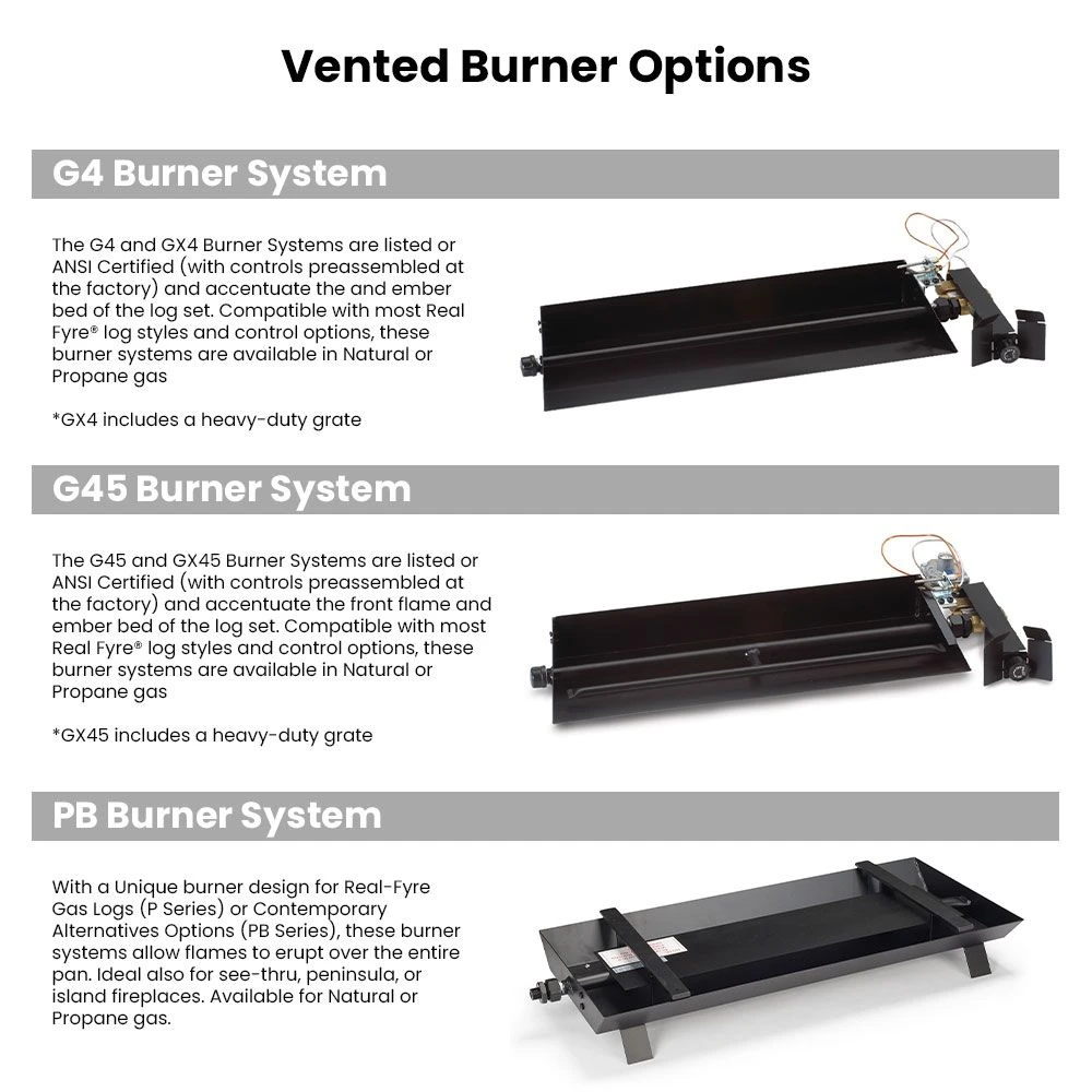 Real Fyre HR Rustic Oak Vented Gas Log Set provides a high end gas log set to enhance your favorite living space with the warmth and comfort of fire. This vented unit is designed to turn your wood burning fireplace into an efficient and warm gas log set that should be used in an approved masonry or approved vented firebox enclosure. This unit features the option to choose between four different ignition types: a manual valve, a remote control with on/off, a remote control with variable flame height adjustment, or a spark to pilot valve with thermostat remote control; if the spark to pilot option is not selected, the pilot light must be match lit and will run continuously to provide ignition to the unit. The unique Rustic Oak log design provides a realistic set of refractory ceramic gas logs that are designed to provide long term durability with a life-like appearance.